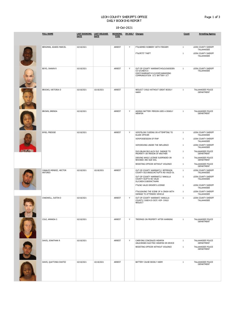Attached is a PDF file containing all bookings at the Leon County Detention Facility from Sept. Medical Marijuana Education and Research Initiative MMERI - October 15 2021. On Sunday August 29 2021.
